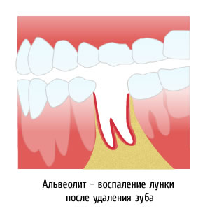 Воспалительный процесс на стенках лунки удаленного зуба называется альвеолитом. При альвеолите происходит повреждение как самой лунки, так и десны. Причиной образования альвеолита может послужить нарушение образованноготромба в лунке, который образовывается при заживлении. Попадание внутрь микробов и вызывает воспаление. Помимо этой причины, воспаление может вызвать отсутствие гигиены рта.