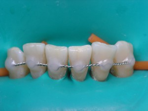 • Шинирование стекловолокном. Для этого на внутренней поверхности зубов делается бороздка, в которую устанавливают стекловолоконную ленту. После борозда с лентой замазывается композитным материалом. В случае верхних зубов бороздку выполняют на внешней поверхности зубов.