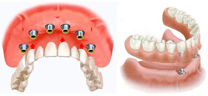 При полном отсутствии зубов или малом их количестве, одним из вариантом протезирования является установка съемных или условно-съемных протезов на имплантаты.